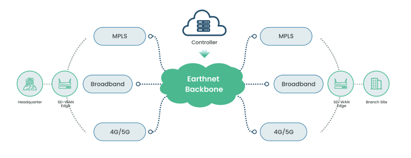 SD-Branch组网模型是各站点通过专线、Internet、LTEs等方式连接到EarthNet Backbone,并通过EarthNet Backbone进行数据转发的网络服务。