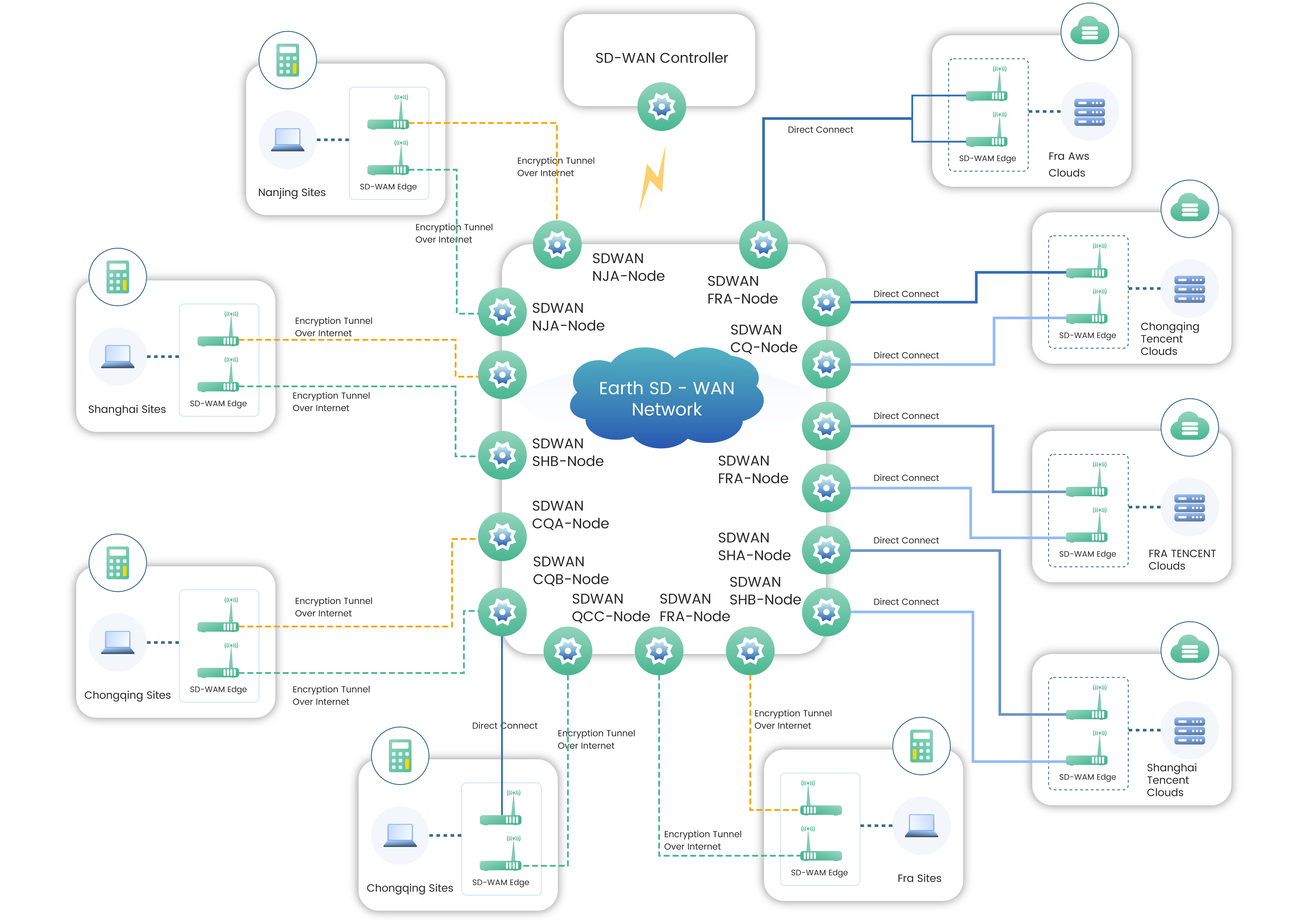 | 使用效果 | 满足站点间组网需求,有效提升了客户访问海外分支站点及公有云SaaS平台的网络品质,无缝衔接域控服务,提高分支节点访问公有云及访问企业内网资源; |