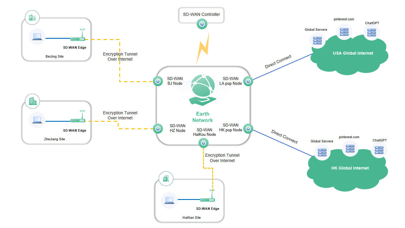 | 使用效果 | 用户各分支节点以internet 方式接入尔司骨干网络,通过尔司全球骨干网络访问到海外互联网,尔司SD-WAN Edge会对客户访问海外各大应用服务进行智能加速; |
