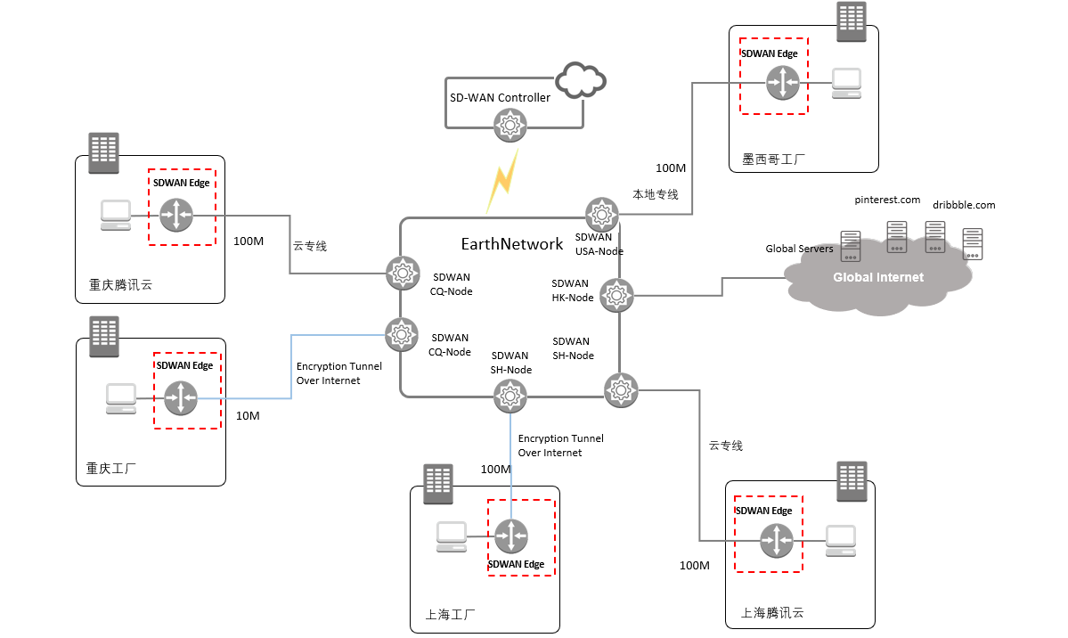 | 使用效果 | 满足站点间组网需求,有效提升了客户各工厂之间的互访,及访问腾讯云的业务质量;通过广域网加速提高客户工厂的生产效率;节省沟通成本; |