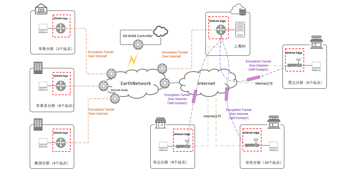 | 扩 展 性 | 未来东南亚工厂及北美办公室也会陆续接入进整个SD-WAN 大网 |