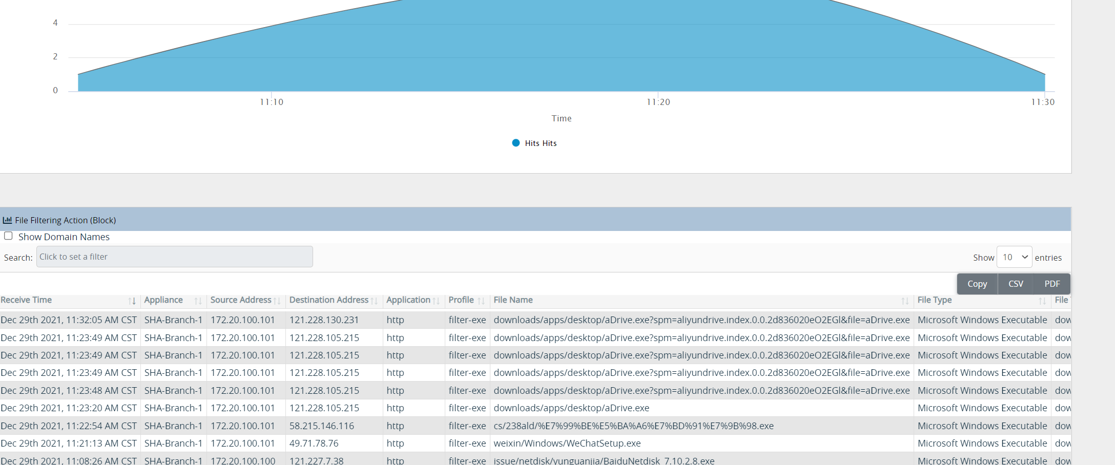 当侦测到病毒文件特征码时,CPE将立刻终端下载链接,并在控制平台留存相关记录,记录可以溯源。系统可以自动生成报表。